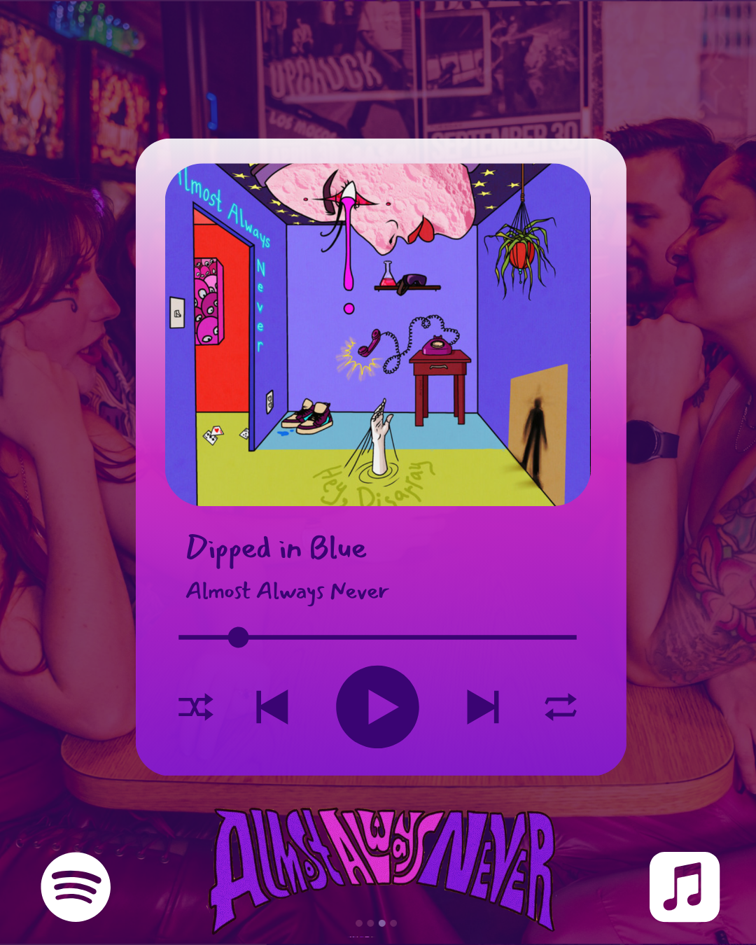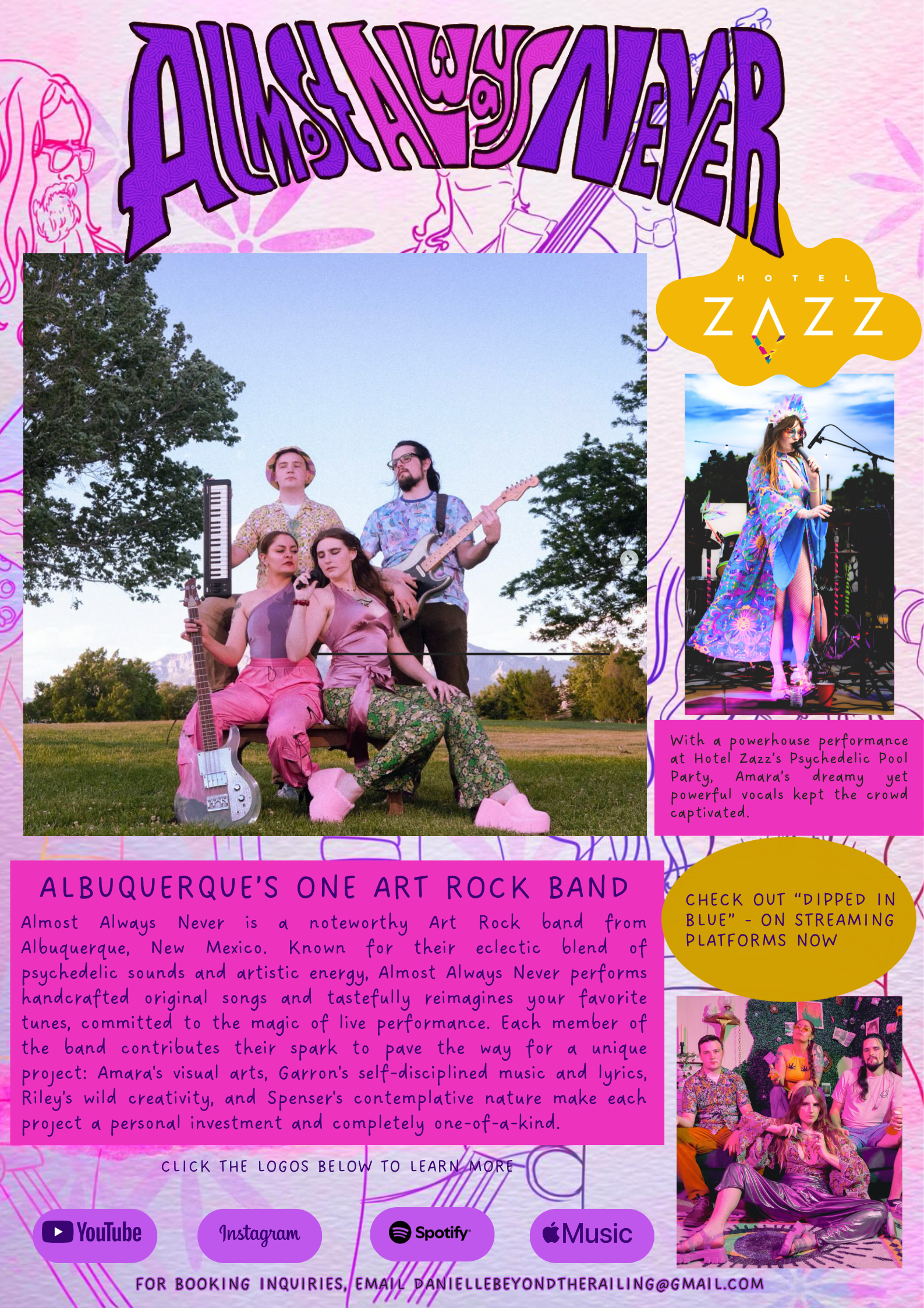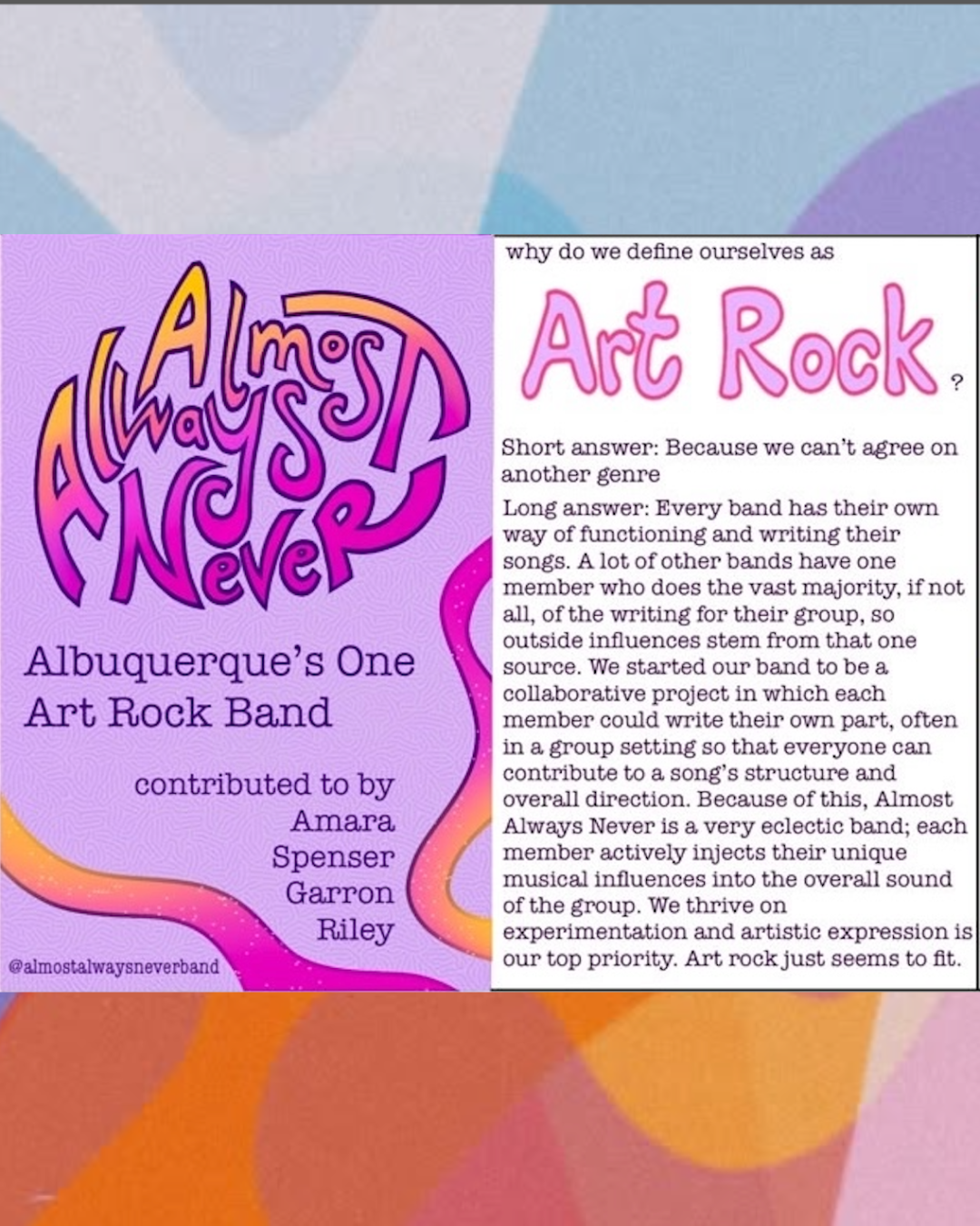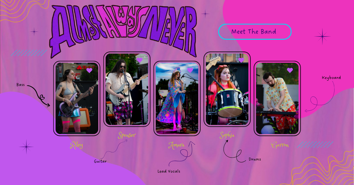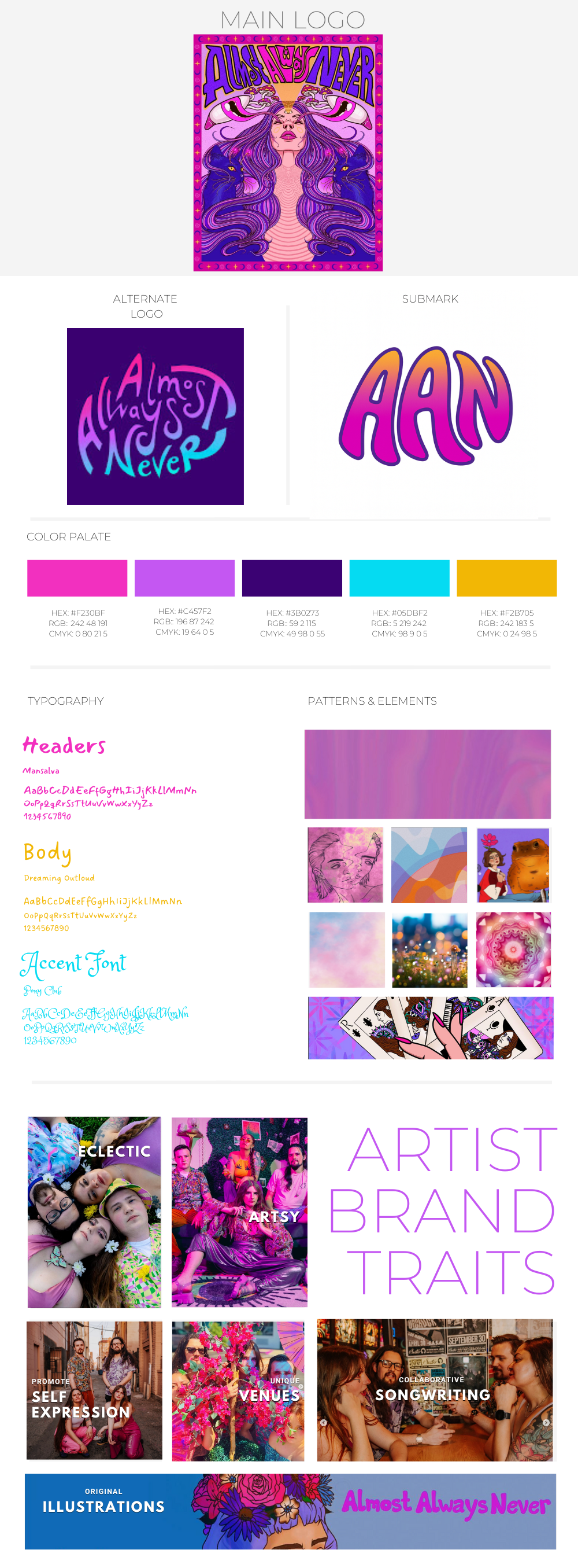 Below are several different components for the band Almost Always Never, based in Albuquerque, New Mexico. The components include the brand style guide, which contains logos, colors, brand traits, and elements related to the brand. It also features five different social media posts to establish AAN's presence in the market. These elements were created using Canva. This project required skills in graphic design, color theory, typography selection, brand identity development, and visual storytelling.